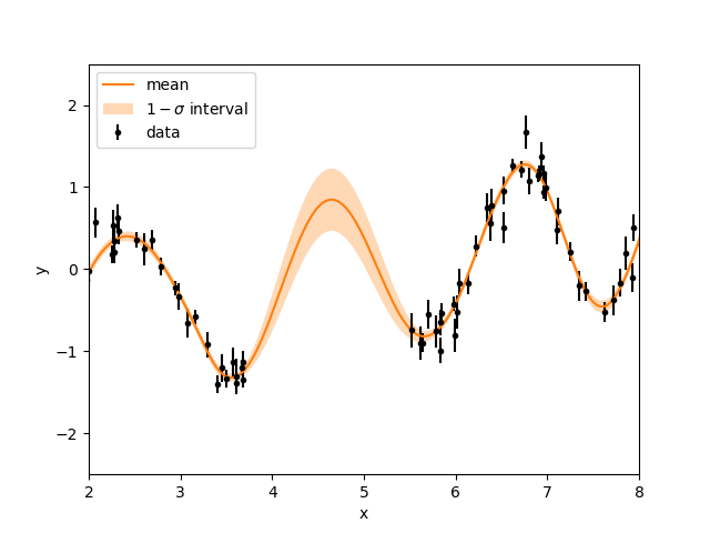 Just like the visual example above, we make many draws from the GP (the multivariarte Gaussian distribution) to see what the model prediction looks like. To make sense of many draws, we usually plot the mean (or median) of these draws and the \(1\sigma\) interval. This shows what the average looking draw looks like, and the \(1\sigma\) interval acts as an error bar. As we can see in the plot below, the GP is conditioned and fits the data and we see that for the missing data points, there is a prediction with some uncertainty made by the GP.