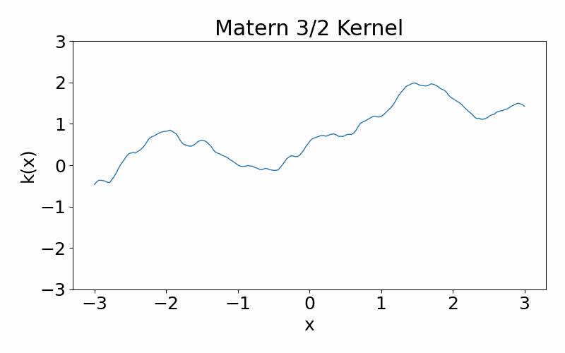 This is generalisation of the radial basis function kernel. It is also stationary. The hyperparameter \(\nu\) controls the smoothness of the function, with \(\nu \rightarrow \infty\) case being equivalent to the radial basis function kernel. \(\nu=3/2\) is once differentiable and \(\nu=5/2\) is twice differentiable. The kernel can be useful if you don’t want your functions to be smooth. You can have a situation where you data appears discontinuous, and the need of a non-smooth function.