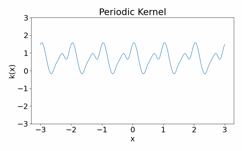 As the name suggests, this kernel allows functions to be periodic. This hyperparameter \(p\) controls the periodicity and the length hyperparameter \(l\) controls the length scale.